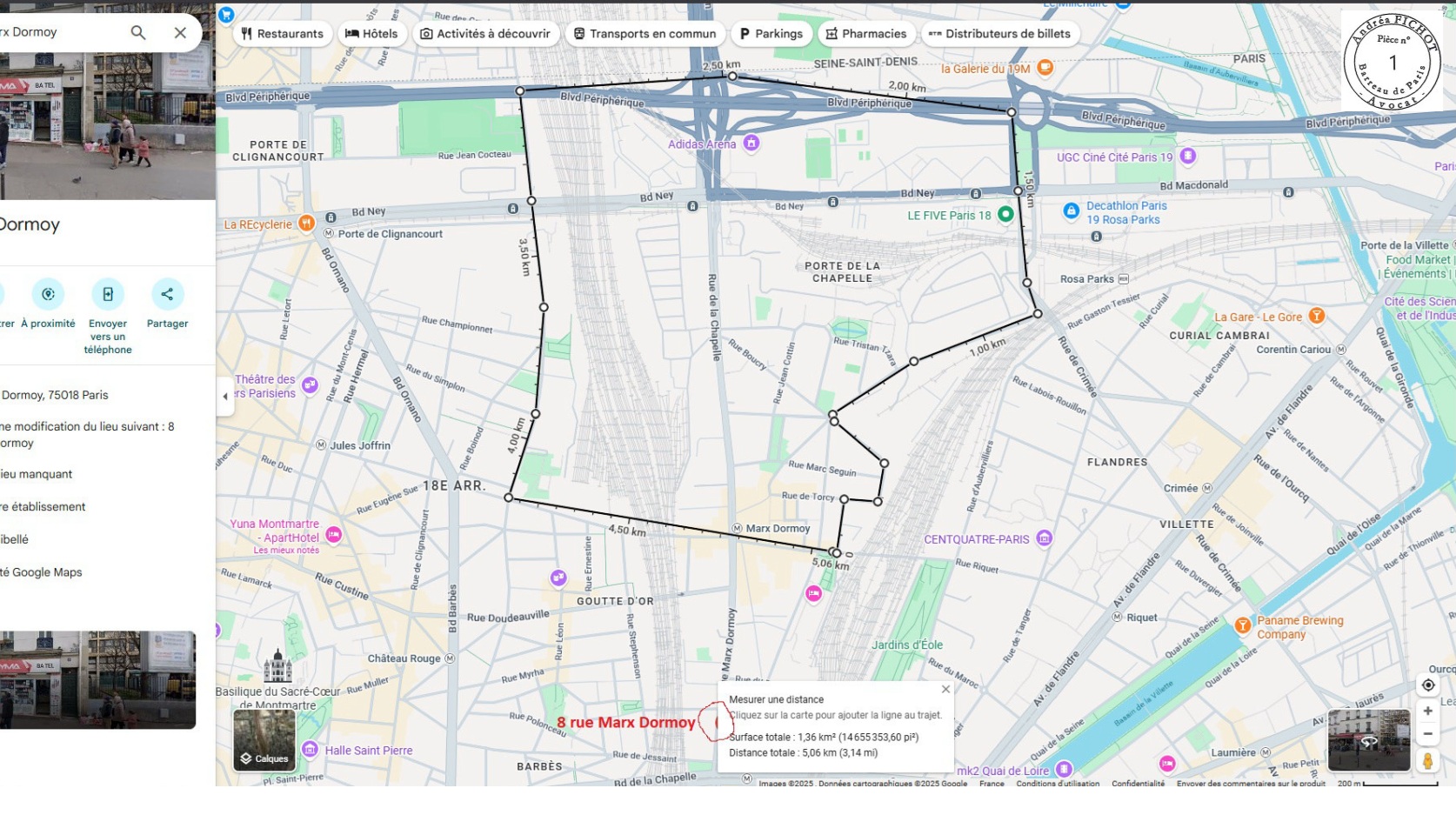 Dans notre cas, la personne avait été contrôlée au 8 rue Marx Dormoy, soit bien au sud du périmètre autorisé par le Procureur.